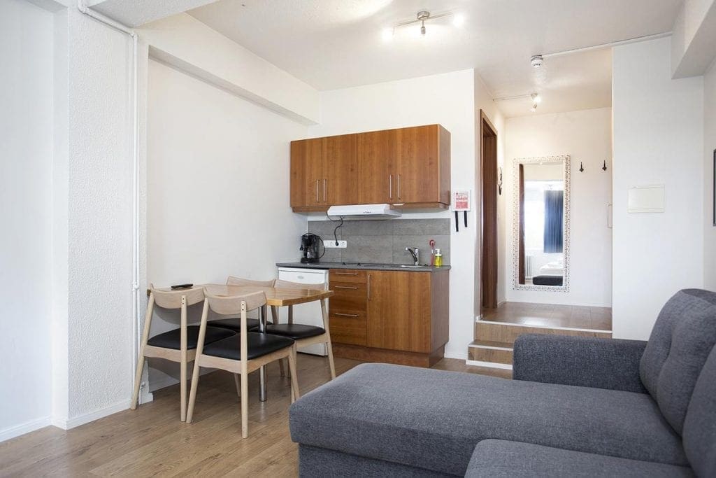 The property includes a Studio Apartment with two single beds, a Family Studio with two single beds and 1 sofa bed, and a Two-Bedroom Apartment with two rooms with three single beds each one and one sofa bed in the living room.