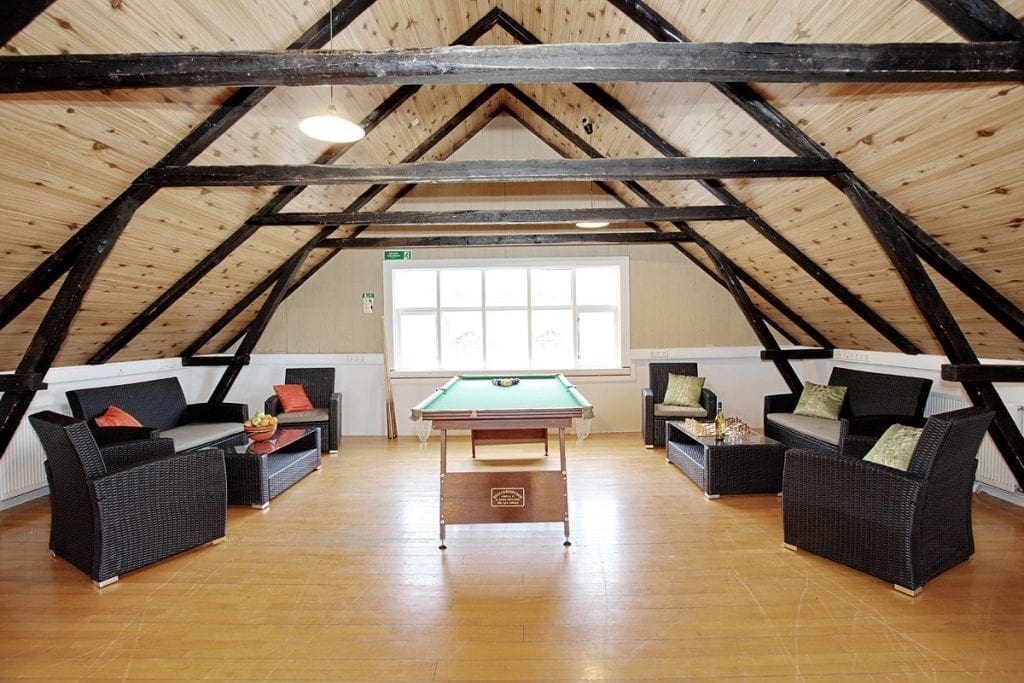 The house is an old Norwegian house with a cozy atmosphere and a spacious common area with a billiard table.