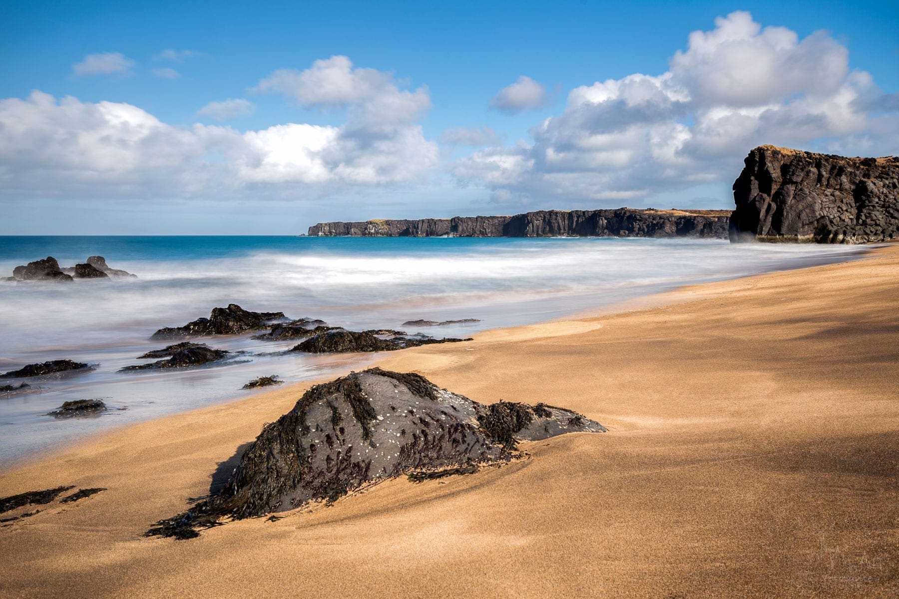 You might think that in Iceland all the beaches you can find are black sanded. Well, Skarðsvík is one exception. The sand has a light yellowish color, and the contrast made by the highlighted lava rocks makes this beach a unique one in the world. But even though all of this is stunning, the most beautiful thing about Skarðvík’s is the color of the ocean. Maybe if you are coming from the Caribbean, you will say its normal, but believe me, the contrast of the light blueish of the sea and the rest of the landscape is breathtaking.