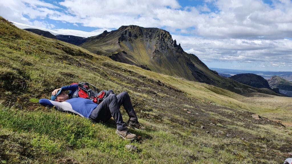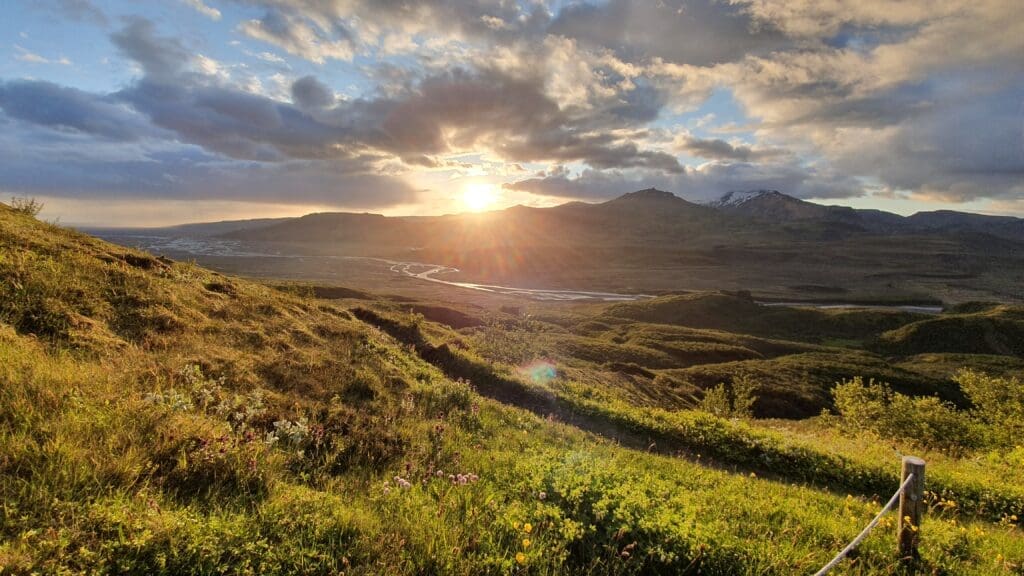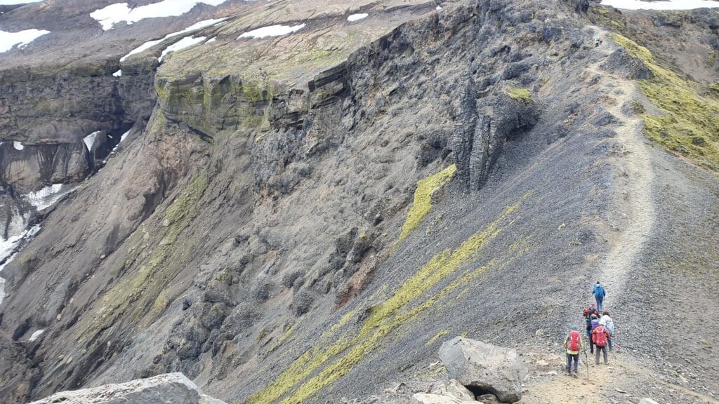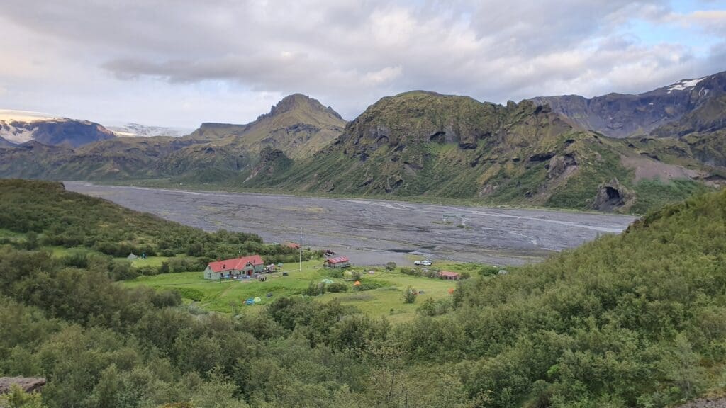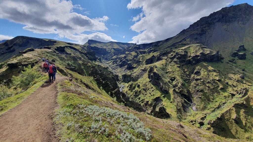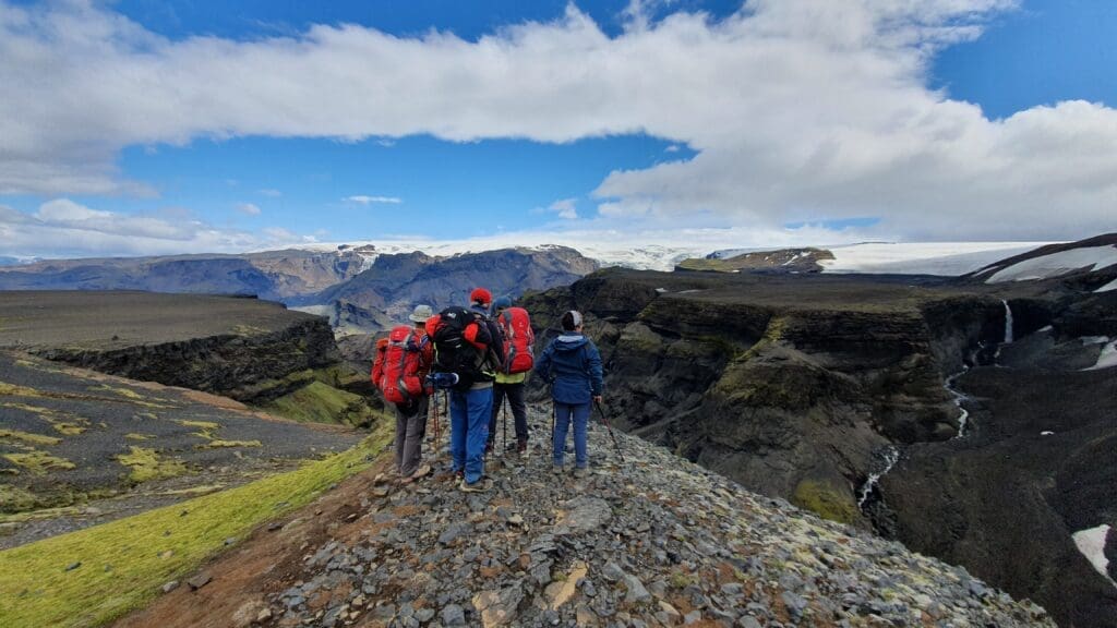 From the Emstrur campsite, the hike begins with a descent into the valley, crossing small streams and tundra landscapes. The transition from the black sand desert to greener areas is remarkable.