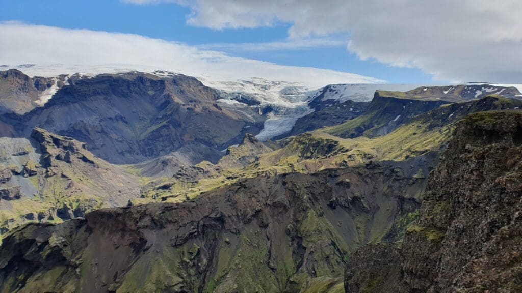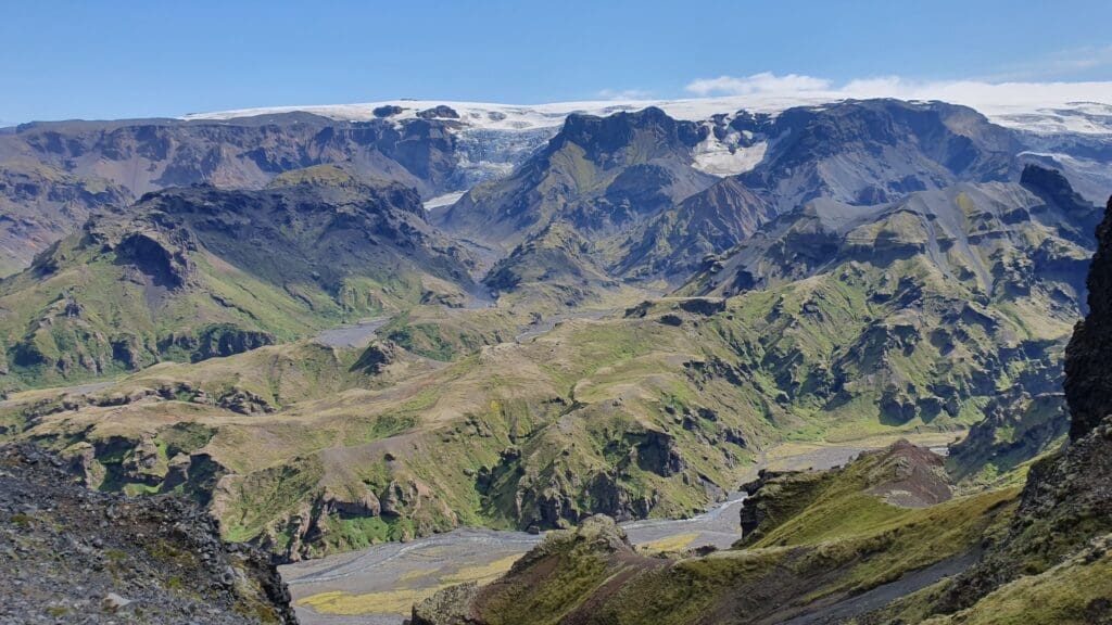 The Thórsmörk valley is known for its stunning views and dense vegetation. Here, green mountains, glaciers, and rivers create a dreamlike landscape. It is one of the most beautiful places on the entire hike.