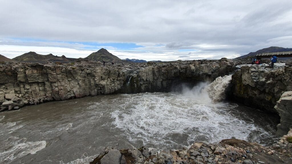 The route continues towards the Brattháls river crossing, where you will cross the Kaldaklofskvísl river. Here, the panoramic views of the valley and surrounding mountains are stunning. It’s a great spot to stop and take photos of the spectacular landscape.