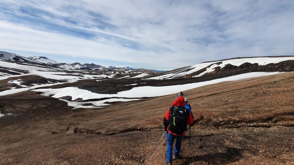 As we ascend, the landscape changes dramatically. We will reach Hrafntinnusker, known for its impressive deposits of black obsidian. Hrafntinnusker also houses the Höskuldsskáli mountain hut, but we will continue our route. In this area, snow and ice formations can remain even during the summer, creating an almost surreal landscape.