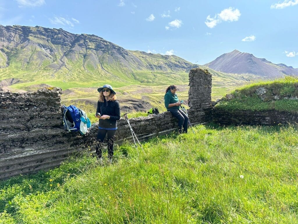 The mountains come in all shapes and sizes and the variety of colors is stunning; everything from the black sand beaches to the pinkish orange hues of the mountain ridges. The trails wind themselves between isolated coves and fjords over colorful hills and through green valleys all the way down to the coast. Abandoned houses and ruins of ancient farms leave their mark on the surroundings.