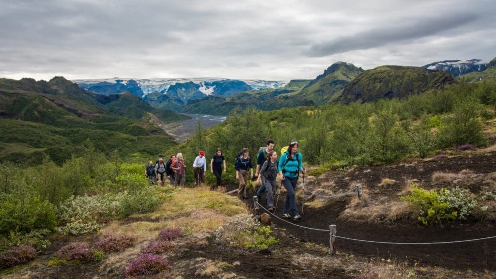 We continue up and down through the small valleys and gullies of Emstrur, where the great Mýrdalsjökull glacier rises only a couple of kilometers away. At the end of the day, the vegetation starts to grow thicker and higher as we descend into Þórsmörk’s (the woods of Thor) green valleys filled with arctic birch forests and colorful flowers. We cross the river Krossá on a footbridge entering the magic landscapes of Goðaland, the abode of the Gods. Nesting at the foot of two glaciers this is a wonderland of ridges and cliffs covered by a multitude of flowers and grasses, certainly fit for gods and humans alike. Even the elves have made themselves at home here. We spend the night in the Básar hut.