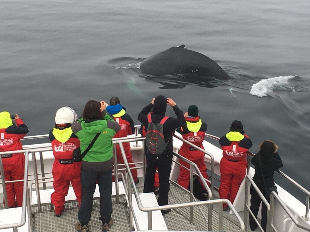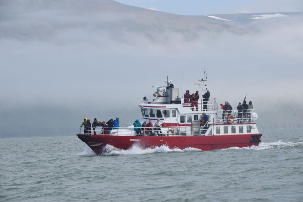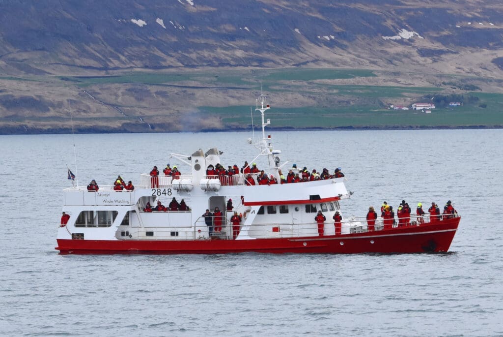 Board our specially designed whale watching vessel on the floating pier, right next to our office. You’re welcome to grab one of our warm overalls before finding a comfortable spot on board – whether that’s inside the heated indoor lounge with panoramic windows or out on deck to enjoy the fresh air and scenic views of Eyjafjörður.