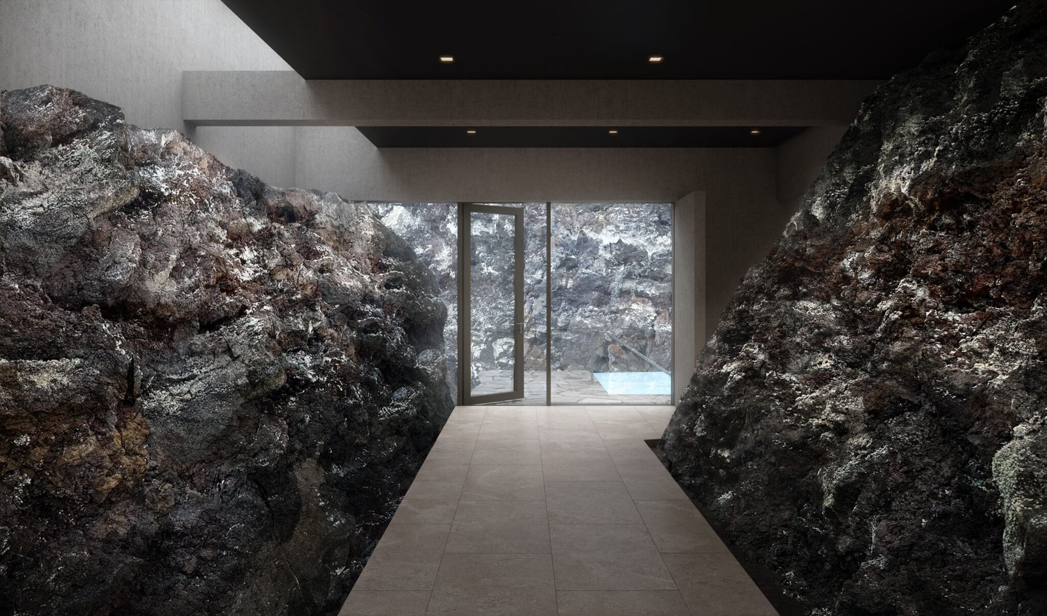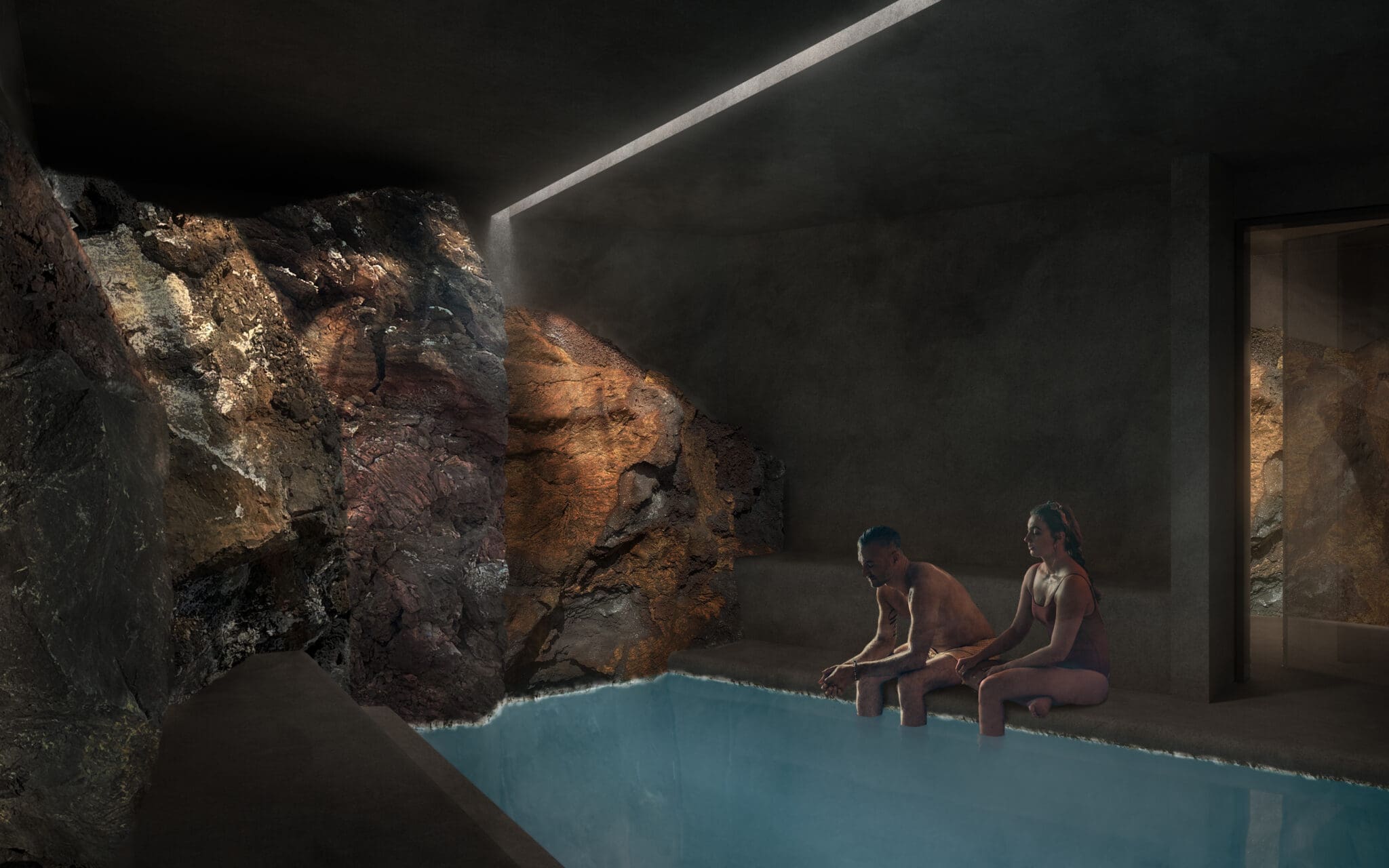 The 2 steam baths are built on top of a geothermal area and the sulfur steam rises up through holes in the floor. The water of the Earth Lagoon is drawn from a borehole that goes 2,500 meters into the ground.