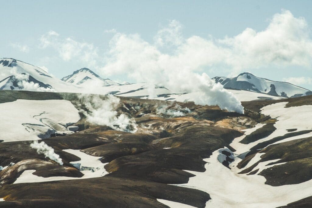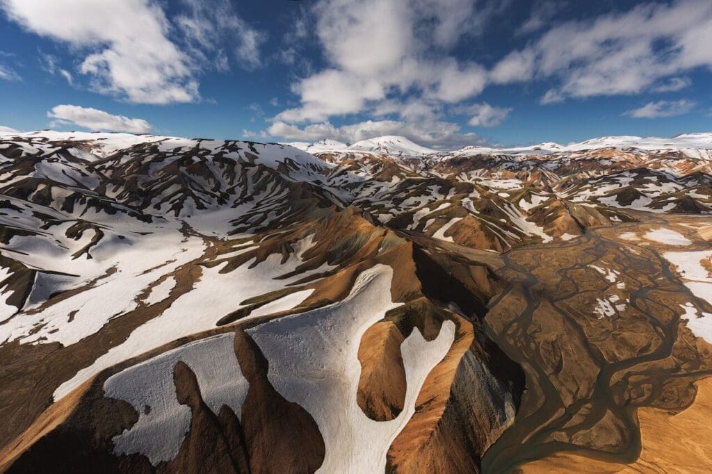 From the geothermal area Hrafntinnusker, we overfly volcanic sand beaches, Myrdalsjokull glacier, Thorsmork and Eyjafjallajokull glacier volcano.