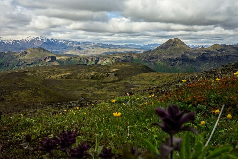 The hike through Fimmvörðuháls, from Skógar to Þórsmörk, is one of Iceland´s best known hiking routes. We will start our day at the 60 m high Skógarfoss waterfall, where we begin our 25 kilometer hike towards Þórsmörk. The trail winds along Skógá River and its many waterfalls, and up between the two Glaciers, Eyjafjallajökull and Mýrdalsjökull. There we will experience the recent lava flow from the 2010 eruption on Fimmvörðuháls and hike on the two volcanic craters – Móði and Magni. From there we will start our decent towards Þórsmörk, where the view can be spectacular. If we are lucky we can see Volcanos, Glaciers, the Highlands and Glacier valleys. Our hike takes us through rough Icelandic landscape and beautiful nature.
