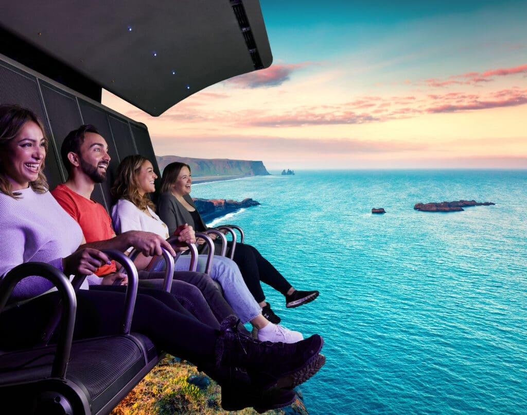FlyOver Iceland is an immersive flight experience.The ride utilizes state-of-the-art technology to give the guest the feeling of flight. Guests sit with feet dangling, before a 20-metre spherical screen while our film whisks you away on an exhilarating journey across Iceland. Special effects, including wind, mist and scents, combine with the ride’s motion to create an unforgettable experience. Before your flight begins, you’ll be immersed in the magic of Iceland in pre-ride events.