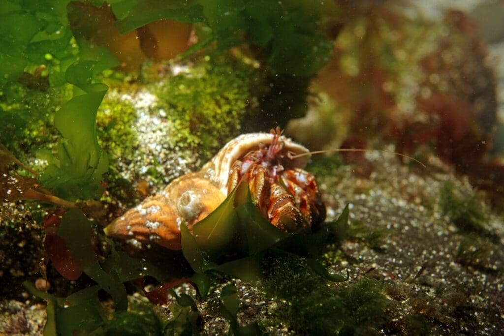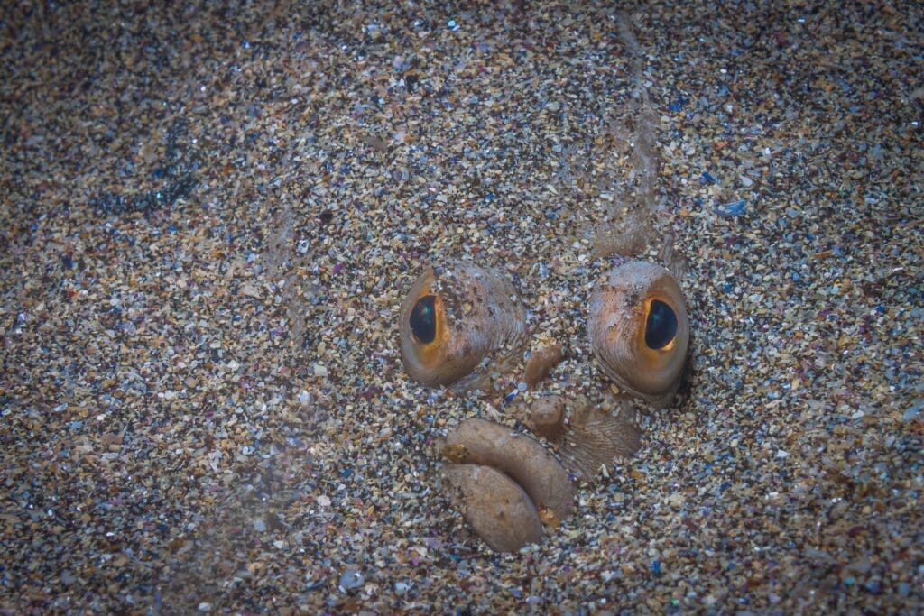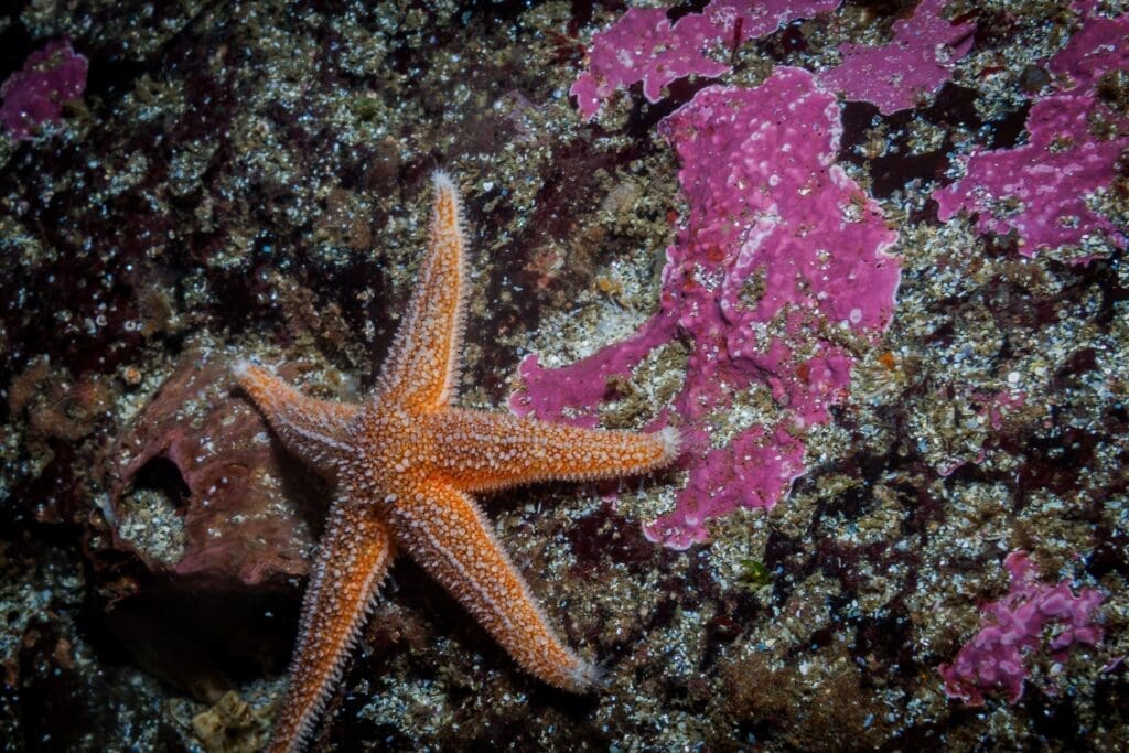 Kelp forests offer a great habitat for a number of marine species, including lumpsuckers, nudibranches, and a wide variety of invertebrates. Colorful algae also flourish here off the coast of Iceland. You will most likely notice pairs of eyes sticking out of the sandy patches of the ocean floor where the flounders live. Soft orange coral also intermittently decorates the sandy ocean floor. In the area of the kelp forests, a wolf fish might pay you an unexpected visit or stick its head out of a pile of rocks, looking a bit like a prehistoric creature.