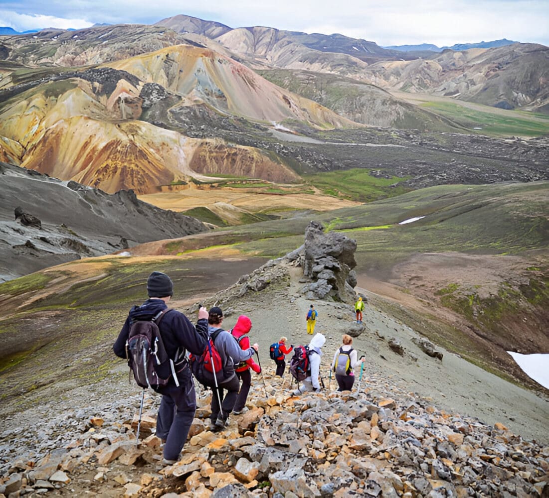 - Hike Begins: Set out from Landmannalaugar with your light daypack. Trek through the vibrant rhyolite mountains, past steaming hot springs, and over challenging terrain towards Hrafntinnusker, then descend to the scenic Álftavatn.