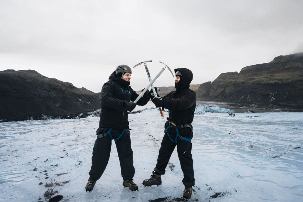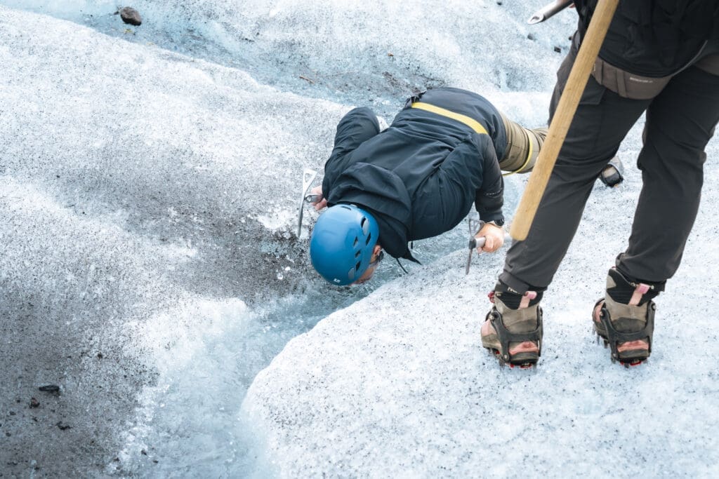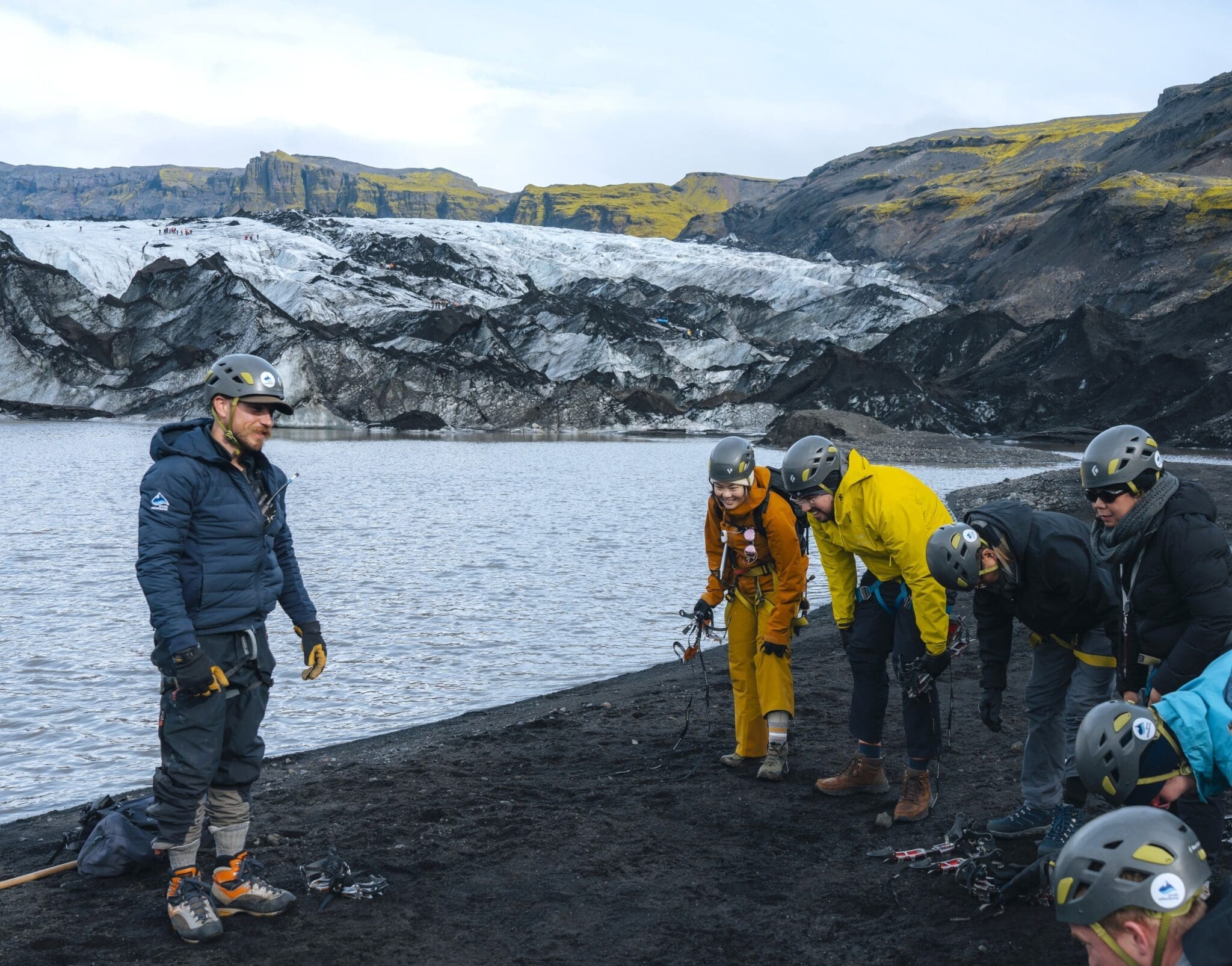 Guided glacier hiking tour on Sólheimajökull glacier with an certified glacier guide and all specialized glacier gear; including glacier crampons, ice axe and other glacier safety equipment.