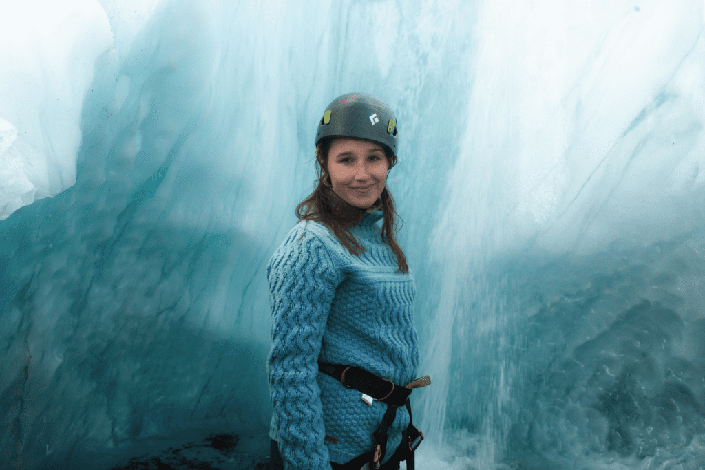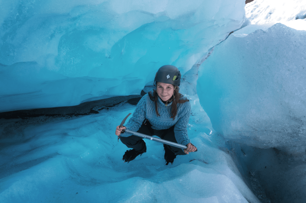 Once you arrive at the glacier parking lot, your guide will begin handing out your gear for the tour. This includes crampons, an ice axe, a harness, a helmet with a headlamp, and hiking boots (if you rented them).