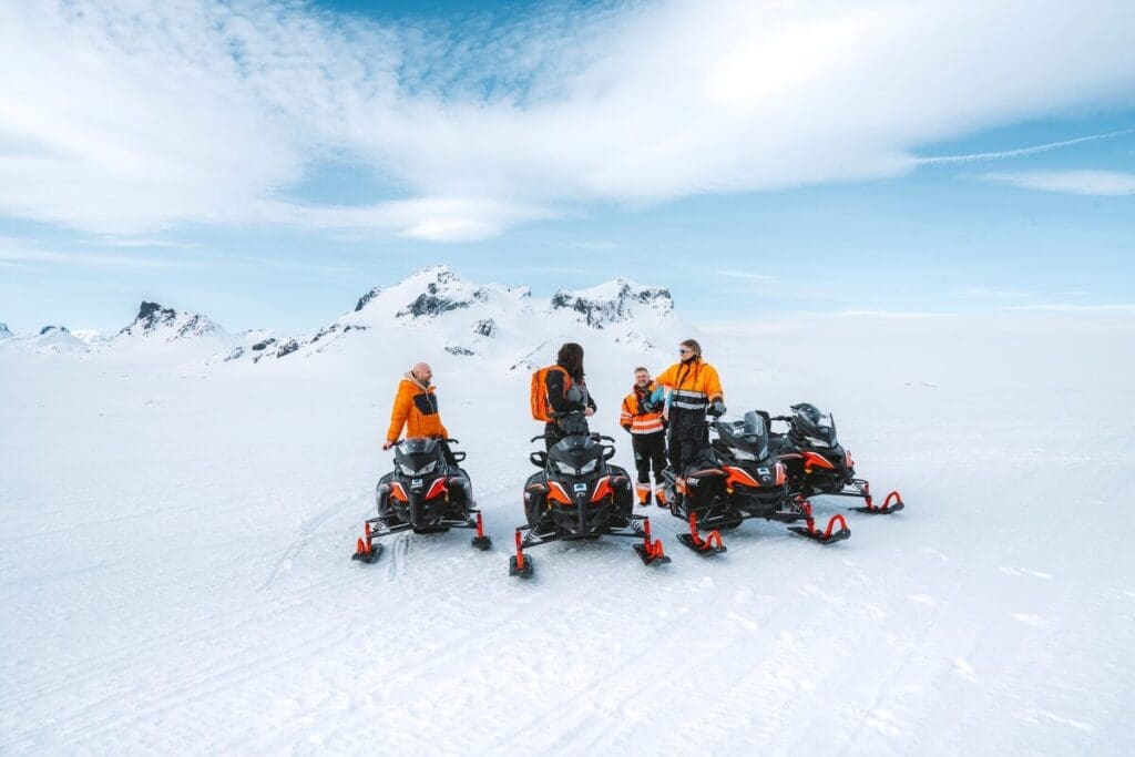 Let's talk snowmobiles – our tours are priced for two people sharing one beast of a snowmobile. But hey, if you're flying solo or just want the whole ride to yourself, you can upgrade to your very own snowmobile for an extra 10.000 ISK per person.
