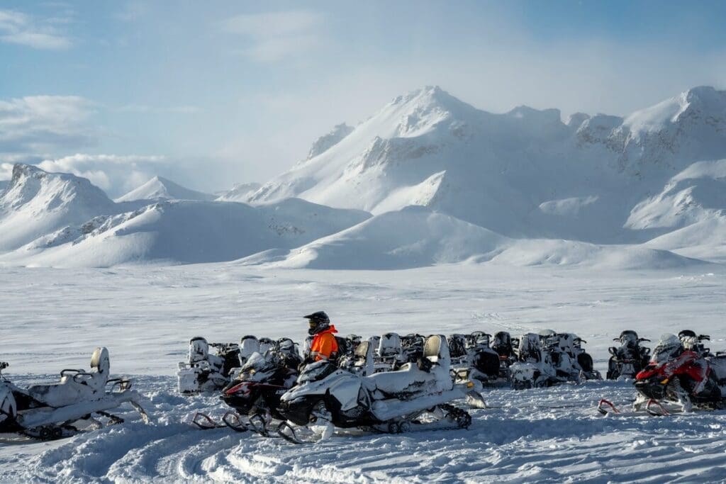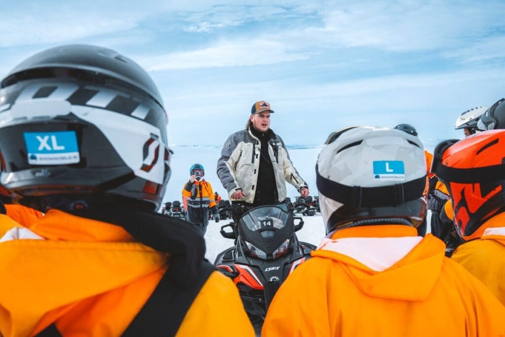 Once we arrive at our glacier base camp, it's time to gear up in all the essentials for snowmobiling – think sleek snowmobile suits, snug gloves, a cozy balaclava, and a helmet to top it all off. And guess what? Your expert snowmobiling guide will give you the inside scoop on how to ride like a pro before we hit the powder.
