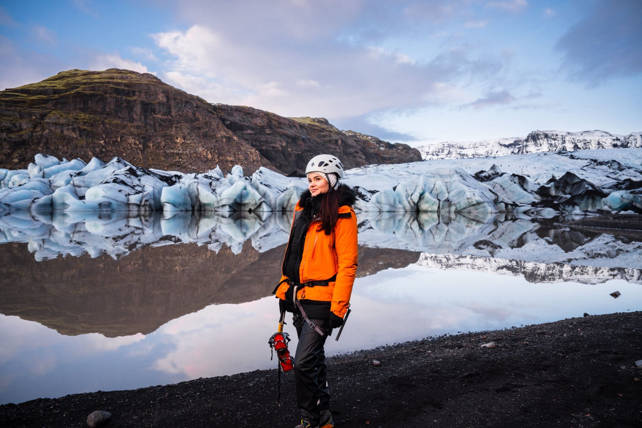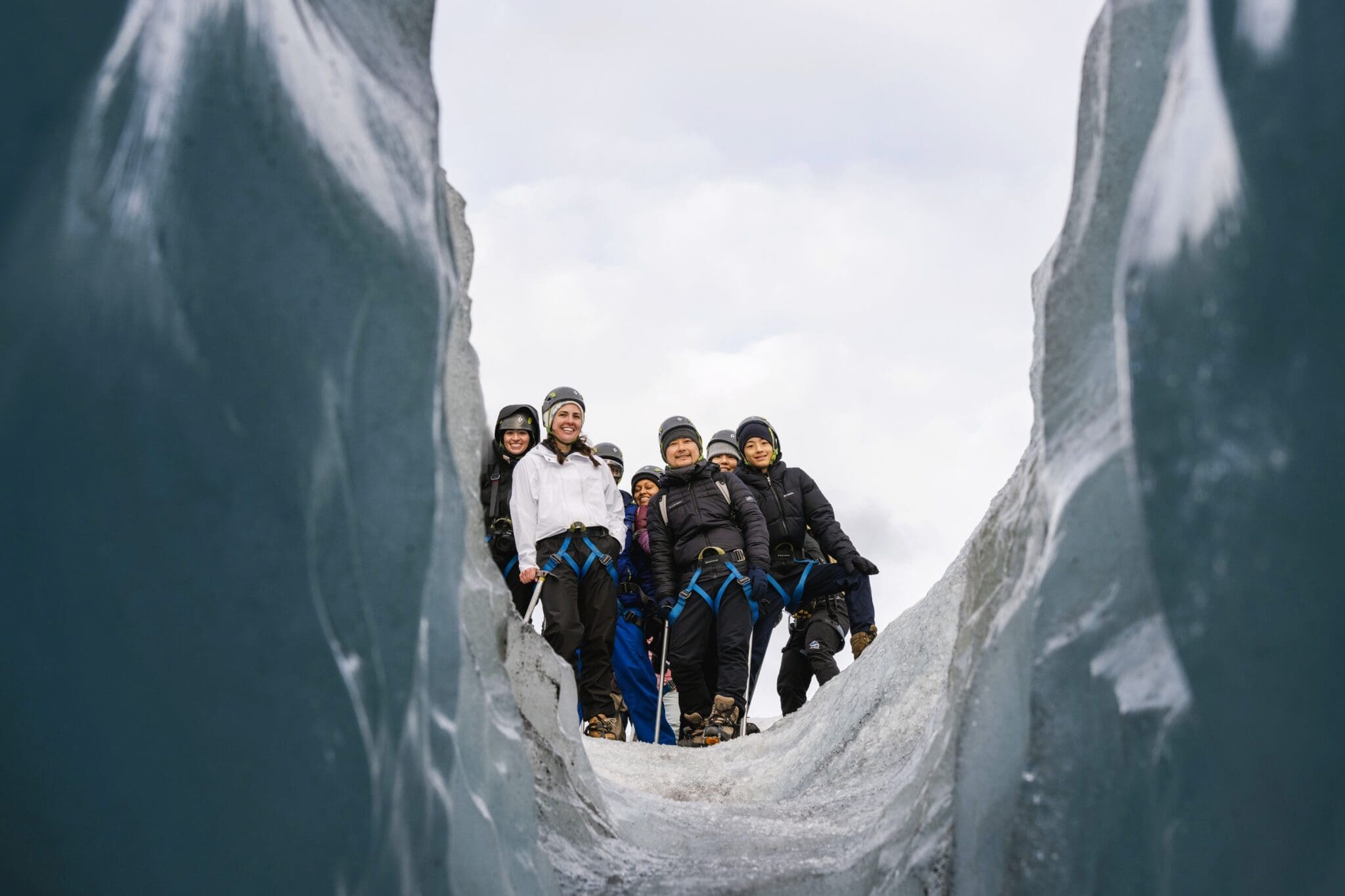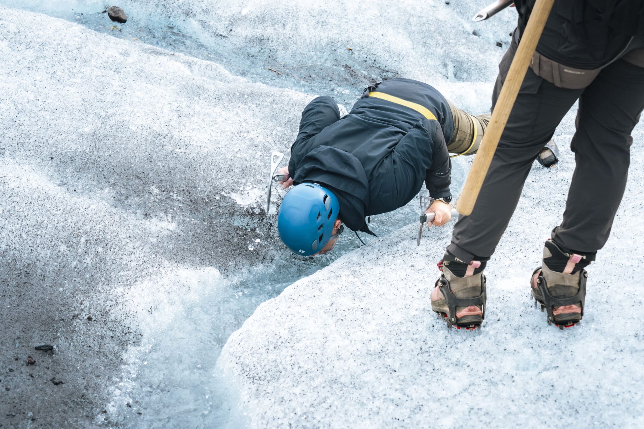 Then, gear up for the highlight of the day: a guided glacier hike on Sólheimajökull, an outlet glacier of Mýrdalsjökull. Your certified guide will provide all the necessary gear and lead you across the ancient ice, past deep crevasses and surreal blue ice formations.