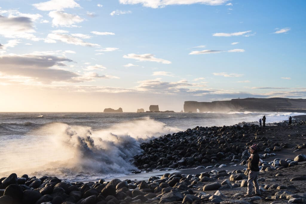 Next, we explore the dramatic Reynisfjara Black Sand Beach, known for its towering basalt columns, hidden sea caves, and the striking Reynisdrangar sea stacks rising from the ocean – said to be trolls turned to stone by the sun.