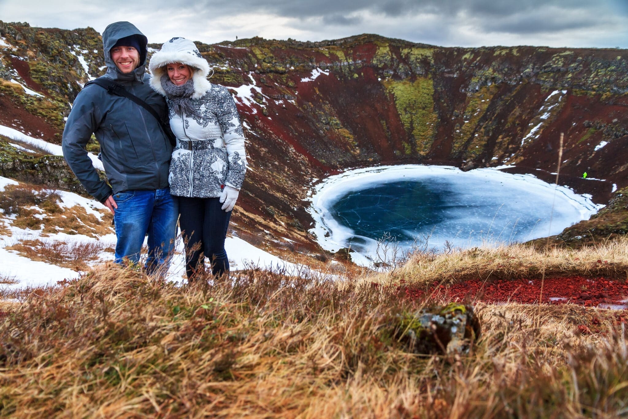 Afterward, you visit Kerid Crater, a striking volcanic crater with deep red walls surrounding a calm blue lake. You can walk along the rim or closer to the water to take in the dramatic colors and serene surroundings, making it a perfect spot for photos and quiet reflection.