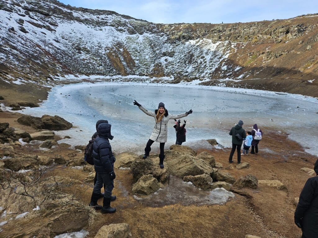 Stop at Kerid Crater, a volcanic crater lake known for its red volcanic slopes and blue water.