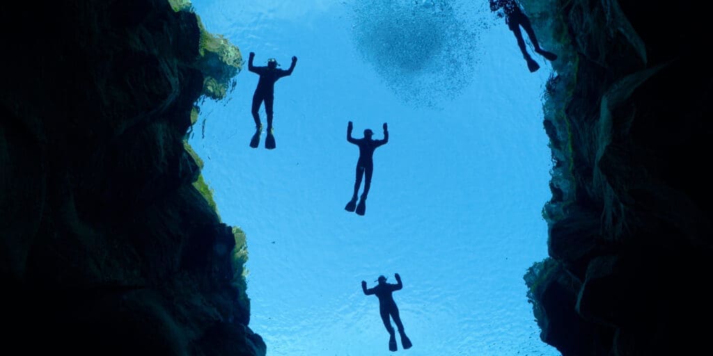 The Silfra Fissure is one of Iceland’s most desirable snorkeling spots. On the surface, this narrow channel of blue water meanders through a giant lava field, beneath active volcanoes and sprawling glaciers, next to the founding site of the world's oldest existing parliament. Below, supernatural shades of blue, perfect visibility, and incredible rock formations make up a magical sub-aquatic chasm. From the comfort of a warmly insulated dry suit, enjoy the feeling of ultimate serenity and weightlessness as you drift peacefully along with the lazy current, awe-stricken at the spectacle in the depths below! Frequently rated as one of the worlds top ten dive sites, the Silfra offers up to 100 meters of underwater visibility and is located on top of the separation between Europe and America!