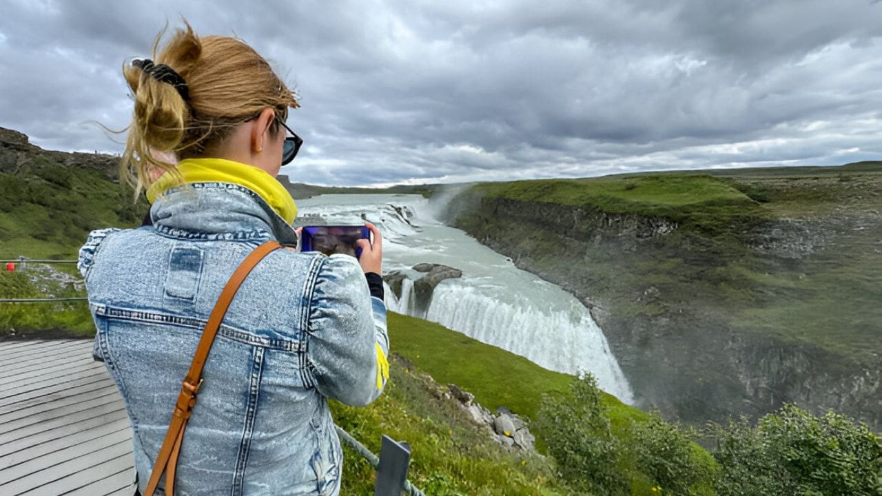 Finally, we arrive at the majestic Gullfoss waterfall, one of Iceland’s most iconic natural attractions. Witness the Hvítá river plunge down two dramatic tiers into a deep canyon, creating a breathtaking spectacle of power and beauty. The sheer force of the water and the surrounding landscape will leave you in awe.