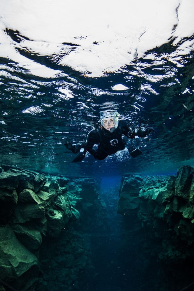 You will be provided with a dry suit and an undergarment to keep you dry and warm while in the near-freezing water. We recommend that you wear thermal long-underwear and wool socks for additional warmth. Make sure to drink some of the Silfra water while you are snorkeling! Who knows when you will be able to drink water so pure again.