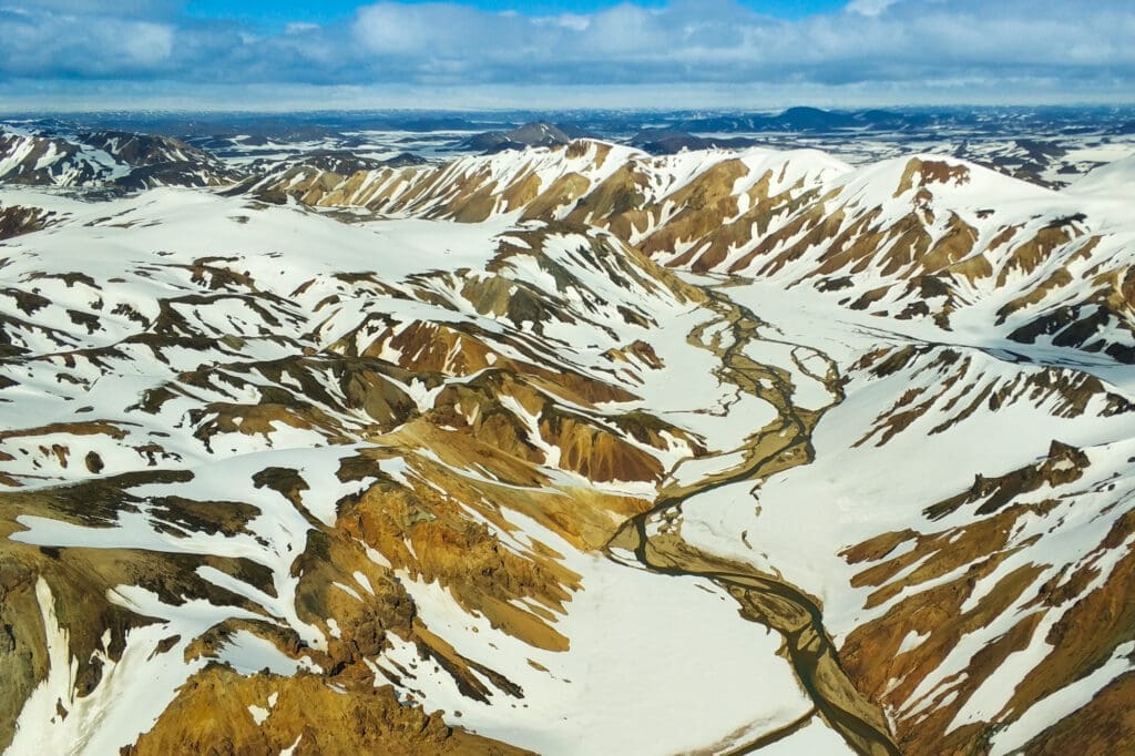 This southern Highlands flight brings together the full force of Iceland's most iconic elements: fire, ice, water, and the colorful geology that sits at the intersection of all three. The route sweeps over the glacier-capped volcanoes of Eyjafjallajökull and Mýrdalsjökull before descending into the hidden valley of Þórsmörk and the vivid, steam-laced landscapes of Landmannalaugar.