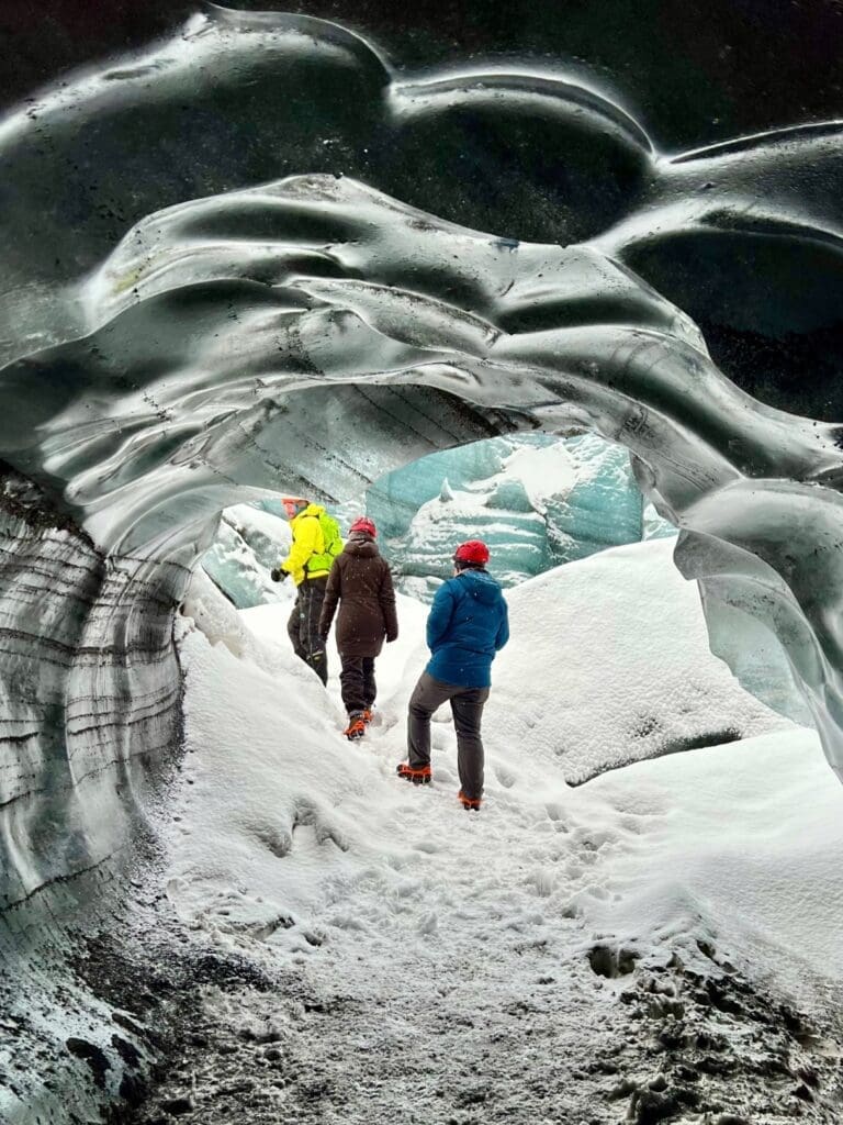 Eventually, we’ll arrive at the base of the Katla glacier, where it’s time to gear up with crampons and helmets which we provide. Then we make our way to the base of the glacier where we’ll find the Ice caves. We spend as much time as is possible on the glacier giving you the chance to really take in this once in a lifetime opportunity.