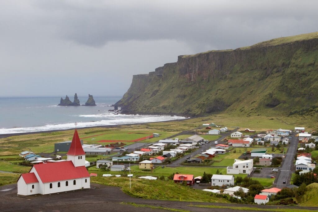 Vík is a charming village surrounded by high beautiful bird cliffs. Reynisdrangar can be seen when looking towards the shore.