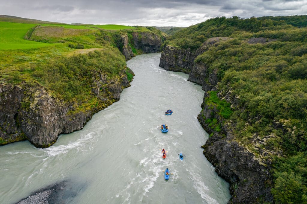 Hvítá river originates from Langjökull glacier, the second largest glacier in Iceland. We begin our journey a few kilometres downstream from Gullfoss Waterfall and travel down 7 kilometres. On route we experience a beautiful view that can only be seen from a boat. The first few kilometres are filled with whitewater rapids and action and the latter kilometres feature serene beautiful canyons. You will sail by Brúarhlöð, a stunning canyon.