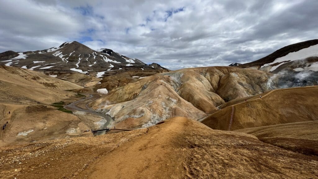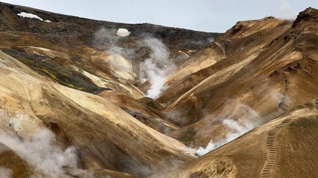 The area is characterised by colourful rhyolite mountains, steaming vents, bubbling mud pots, and glacial rivers.