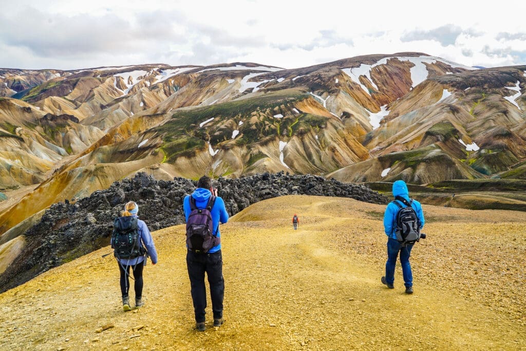 With a total hiking distance of about 8-10 km (5-6 mi), this route offers unforgettable views over the Fjallabak Nature Reserve and countless photo opportunities. To end the day, enjoy a relaxing soak in the natural Landmannalaugar hot pool beside the Laugahraun lava field – an iconic Highlands experience.