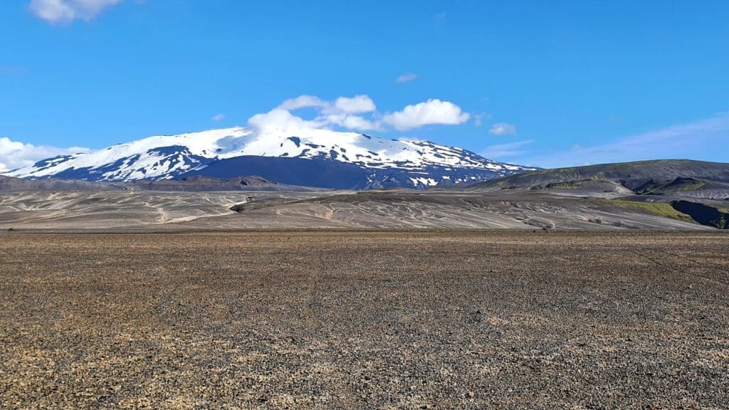 Der Rückweg führt uns streckenweise durch eine Bimssteinwüste unterhalb des berüchtigten Vulkans Hekla. Die Hekla (Kapuzenträgerin) wurde früher auch für einen Ort gehalten, an dem der Teufel die Seelen der Verdammten zum Abkühlen an die Oberfläche holte, damit sie sich nicht zu sehr an das Höllenfeuer gewöhnen. Die Hekla ist ein 1.491m hoher Zentralvulkan und gehört zu den aktivsten Vulkanen Islands. Sie ist berüchtigt für ihre kurze Vorwarnzeit von ca. 30 Minuten vor einem Ausbruch und ihr letzter Ausbruch war im Jahr 2011.