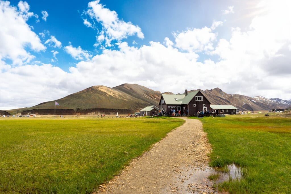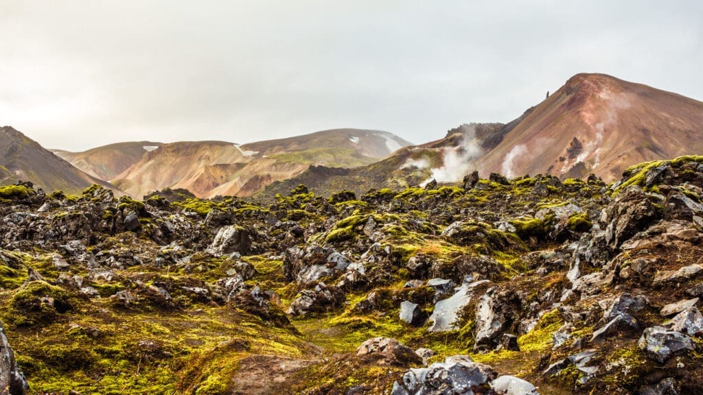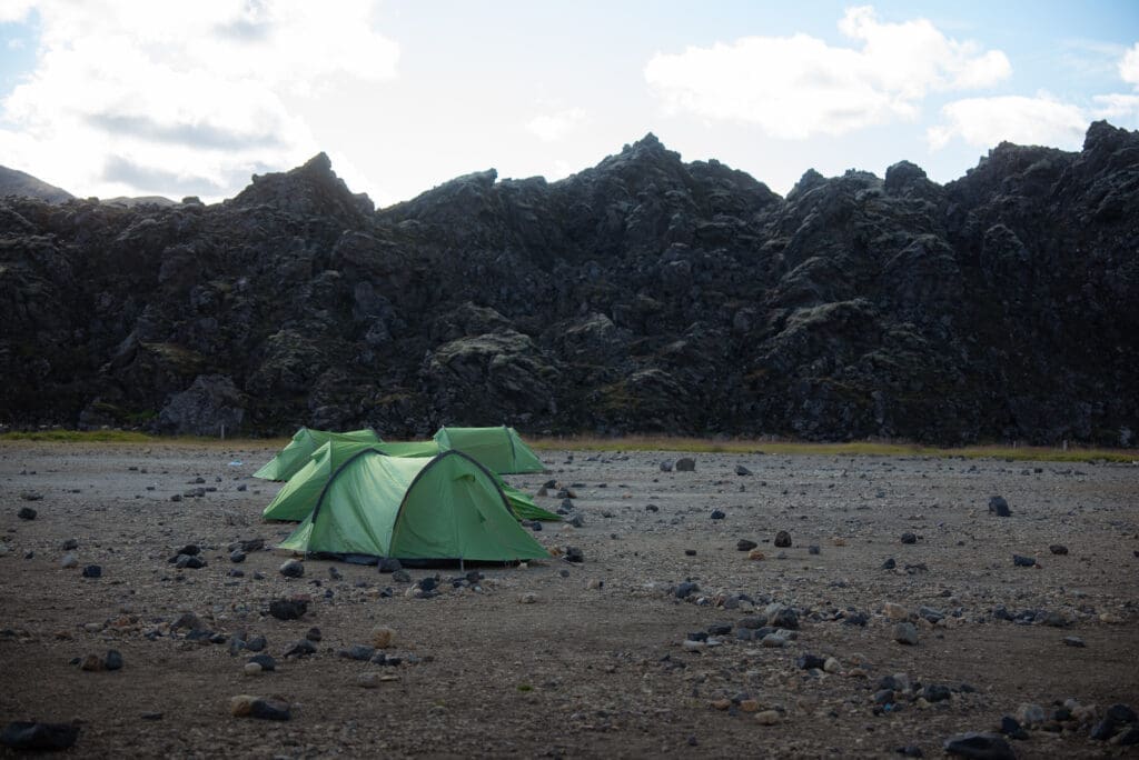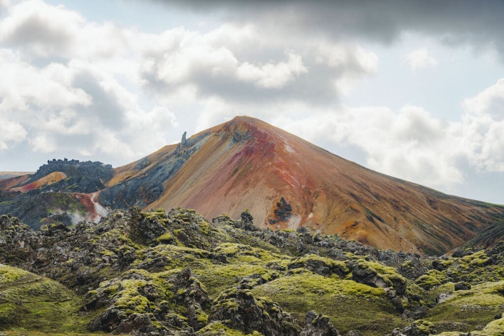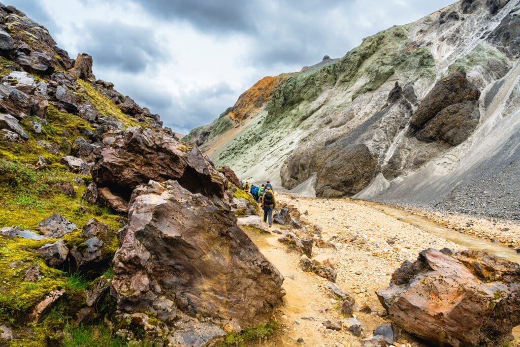 The Laugavegur Trail starts in the vibrant geothermal region of Landmannalaugar. Before jumping into the full trek, you’ll spend the first day on a warm-up hike to get your legs moving and ready for the days ahead. This scenic loop winds through some of the area’s most unforgettable terrain, including the surreal Laugahraun lava field, the colorful Grænagil gorge, and the impressive Bláhnjúkur volcano. It’s the ideal way to settle into the rhythm of the trail while taking in the raw beauty of the landscape.