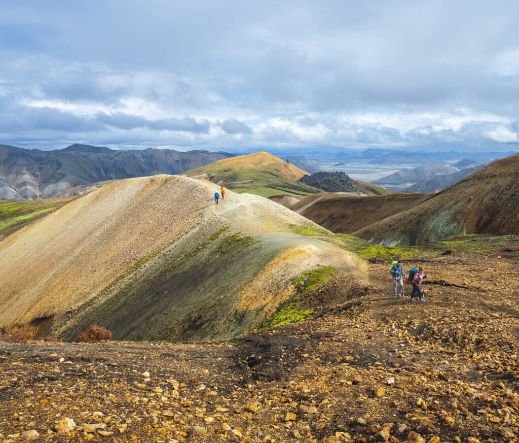 From Hrafntinnusker, we descend into the gullies of Jökultungur, a geothermal wonderland filled with steaming hot springs and bubbling mud pools. Over time, geothermal activity has painted these gullies in vivid shades of yellow and red, contrasting beautifully with the pale sand-toned peaks around them. At the top of Jökultungur, we’ll take in breathtaking views of the Fjallabak region and, weather permitting, catch glimpses of the Mýrdalsjökull, Eyjafjallajökull, and Tindfjallajökull glaciers.