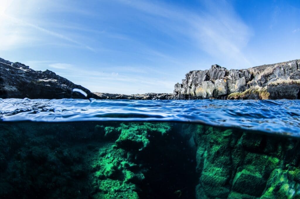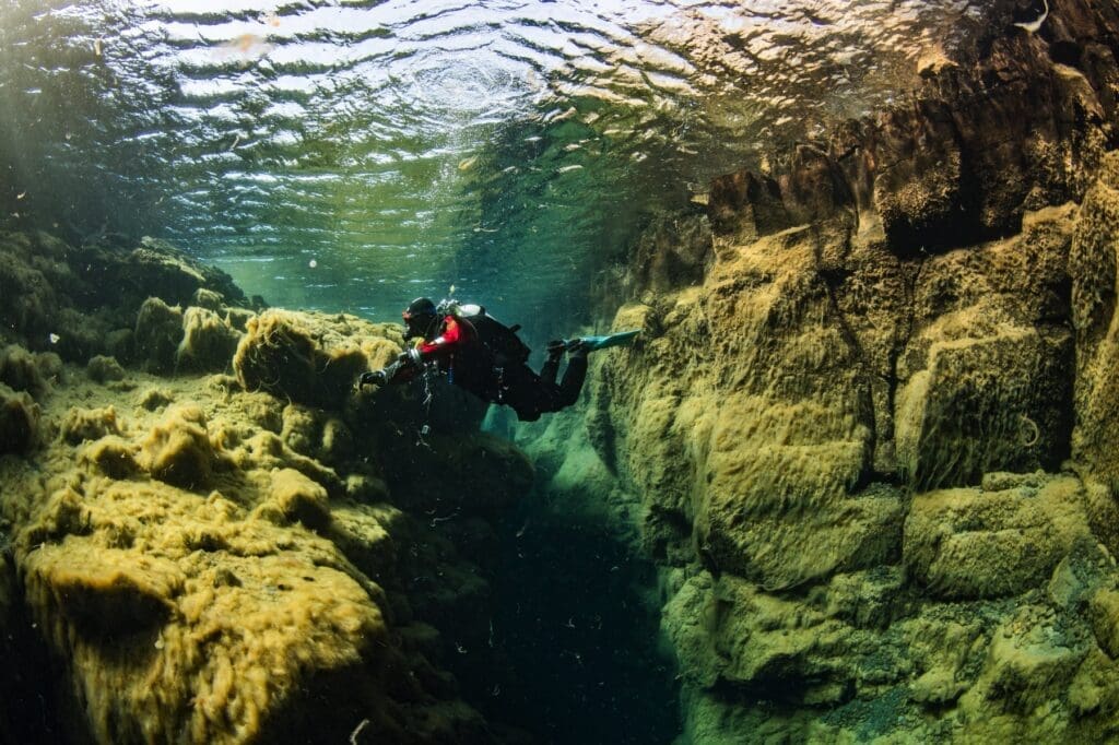 The water in Bjarnagjá is mostly fresh groundwater but it is influenced by the salinity of the sea as the rift is only few hundred meters from the coast. So divers can spot wildlife in the fissure. As an added bonus, a boat has been placed in the bottom of the fissure.