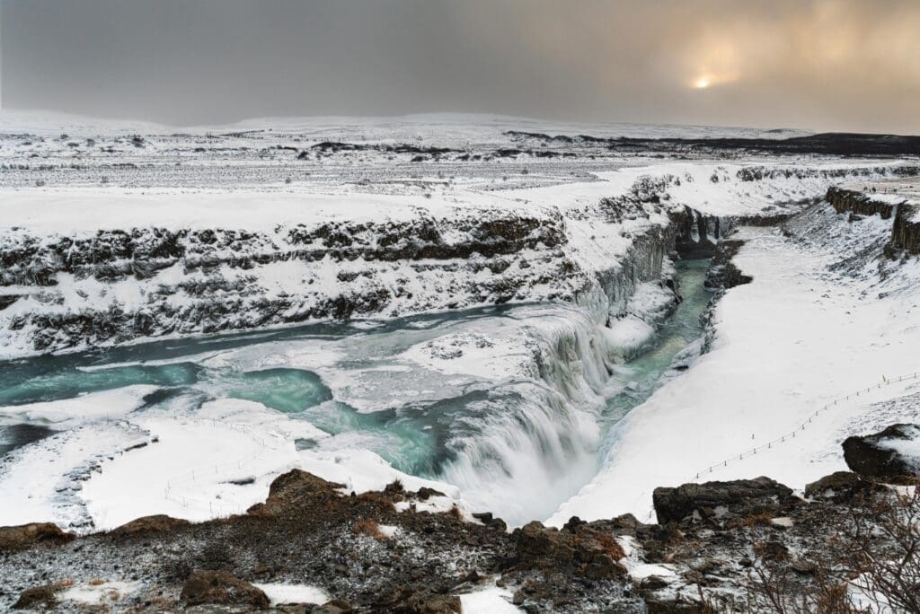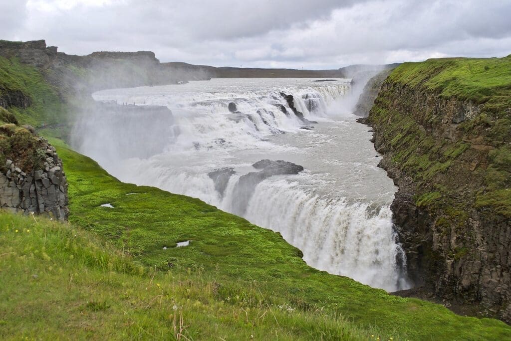 Gullfoss (e. Golden Falls), is a magnificent waterfall, believed to have gotten its name from the golden hue shining in its glacial water. Located in a narrow gorge of basalt lava columns, Gullfoss is located in the third-longest river in Iceland, Hvítá (e. White River), a white glacial river flowing from its source Hvítárvatn (e. White River Lake), fed by glacial water from the second-largest glacier in Iceland, Langjökull (e. Long Glacier). Gullfoss consists of two cascades, forming a tiered three-step “staircase”, with white glacial water plunging 32m down into the 2.5km wide basalt gorge Gullfossgljúfur (e. Golden Falls Gorge).