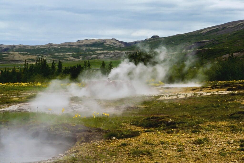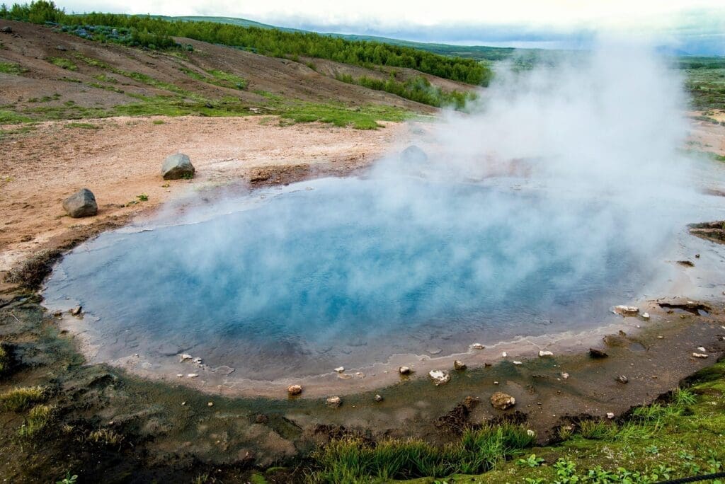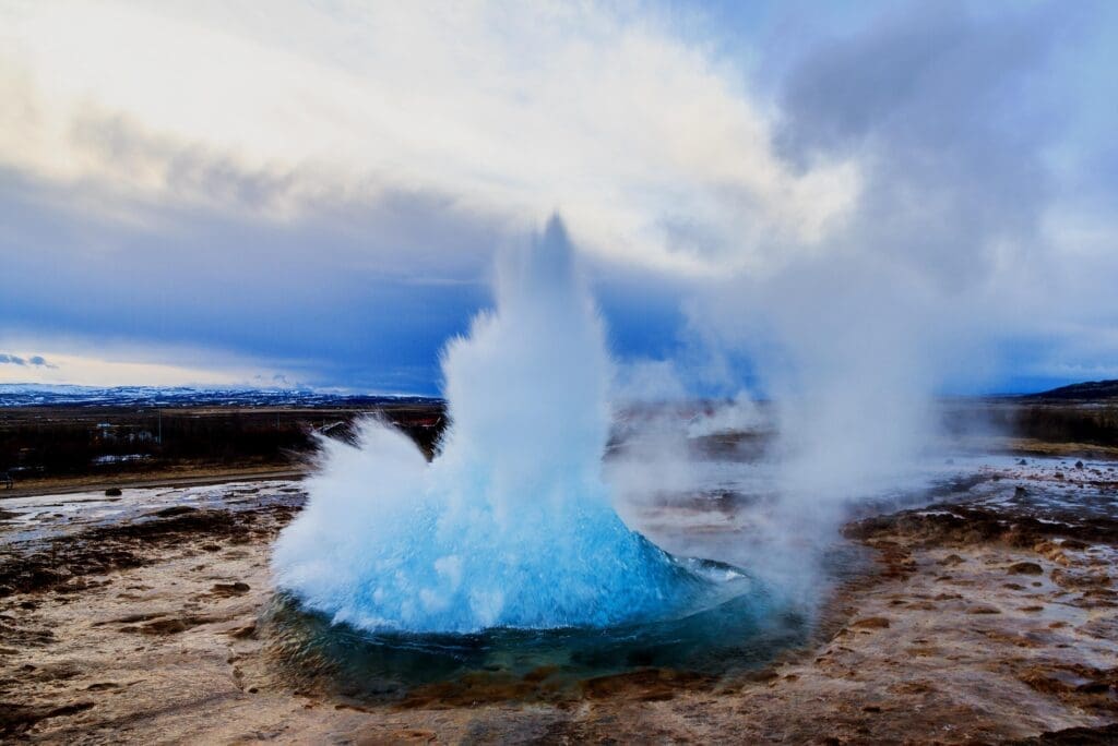 Geysir (e. Spouter) is the most renowned geological phenomenon in Iceland, giving its collective name geyser to all other hot springs in the world. It is currently dormant and hasn’t spouted since 2016, but earthquakes in the area and volcanic activity in our country may cause Geysir to awaken someday and the other hot springs in this geothermal area to show changes in behavior.