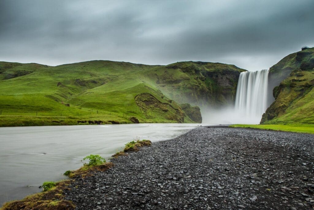 Skógafoss is one of the most beautiful waterfalls in Iceland dropping 60 m (197 ft) off an eroded cliff with an astounding width of 25 m (82 ft) and up to 30 m (98 ft) after heavy rain. It is located on the river Skógá which flows from under Eyjafjallajökull, a glacier-capped volcano that last erupted in 2010. In that eruption, Skógafoss became grey from all the ash blowing into the Skógá river. Skógafoss produces a great amount of spray so on sunny days, you may see a rainbow forming, some days even a double rainbow. Underneath the waterfall the land is flat, making it easy to walk right up to it, but make note you may get wet from the spraying. If you’re up for it you can also view Skógafoss from the top since a 527 step staircase leads up to an observation platform above it with an amazing view of the coastline. The cliff on which Skógafoss cascades marks the former coastline of the south coast. This magnificent waterfall has been featured in various popular culture; the music videos Fjara by Sólstafir in 2012 and I’ll Show You by Justin Bieber in 2015, the 2013 films Thor: The Dark World and The Secret Life of Walter Mitty, and the TV series Vikings (season 5) and Game of Thrones (season 8).