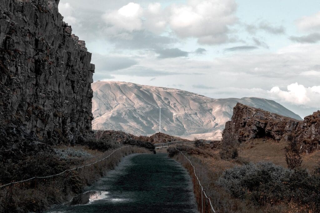 Þingvellir (e. Parliament Grounds) is a fracture zone situated on the tectonic plates of the Mid-Atlantic Ridge, the North-American and the Eurasian continents, which runs through Iceland from its NE corner to the SW corner, forming a great depression of about 40 km in length and 10 km in width. These boundaries are only visible above ground in very few locations in Iceland. Almannagjá (e. Public’s Rift) forms the eastern boundaries of the North-American plate, while Hrafnagjá (e. Raven’s Rift) forms the western bounds of the Eurasian plate. The area between these two rifts is slowly subsiding, pulling apart by about 3-4 millimeters every year.