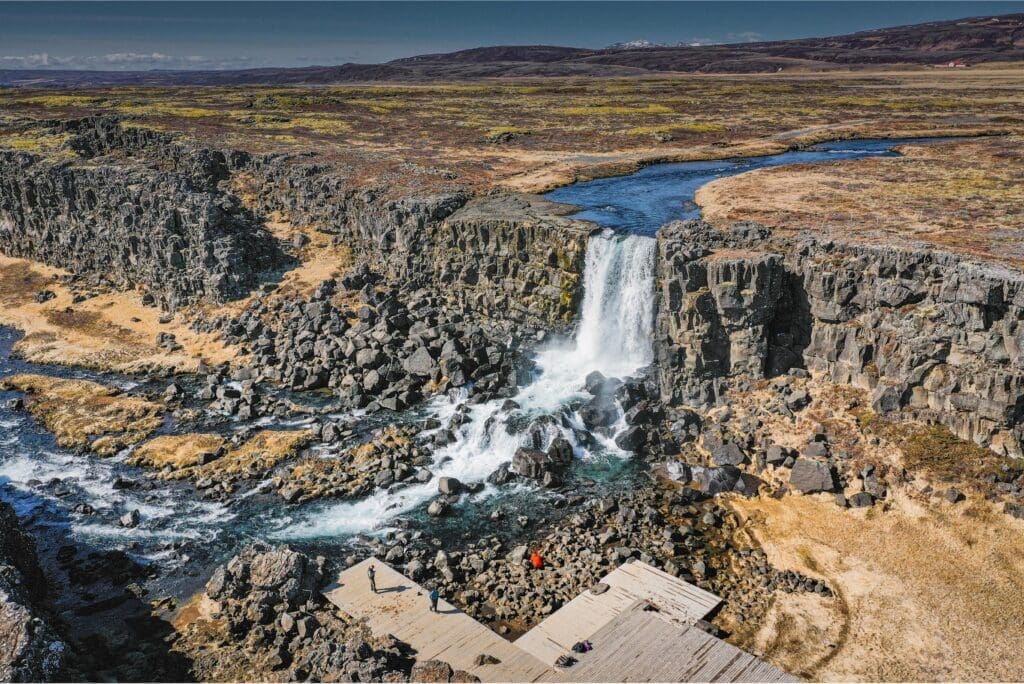 Heading out of the city, you will pass Icelandic farms on the way to the first stop of the tour; Thingvellir National Park. This is the first national park in Iceland and the first UNESCO World Heritage Site in our country. You will start at Hakið lava mesa, a viewpoint that gives you an amazing view over the Thingvellir area and Thingvallavatn, the largest natural lake in Iceland (about 83.7 square kilometers and 114 meters at its deepest point). You go down from Hakið into Almannagjá by Thingvallabær rectory, today serving as the Prime Minister's summer house, and Thingvallakirkja, a beautiful wooden church representative for common Icelandic churches. In Almannagjá dwells Öxarárfoss, a 12-meter man-made waterfall from when the Vikings changed the course of the Öxará river to channel into Almannagjá, so they could water their horses and sheep when assembling at Althingi each summer, the Icelandic parliament.