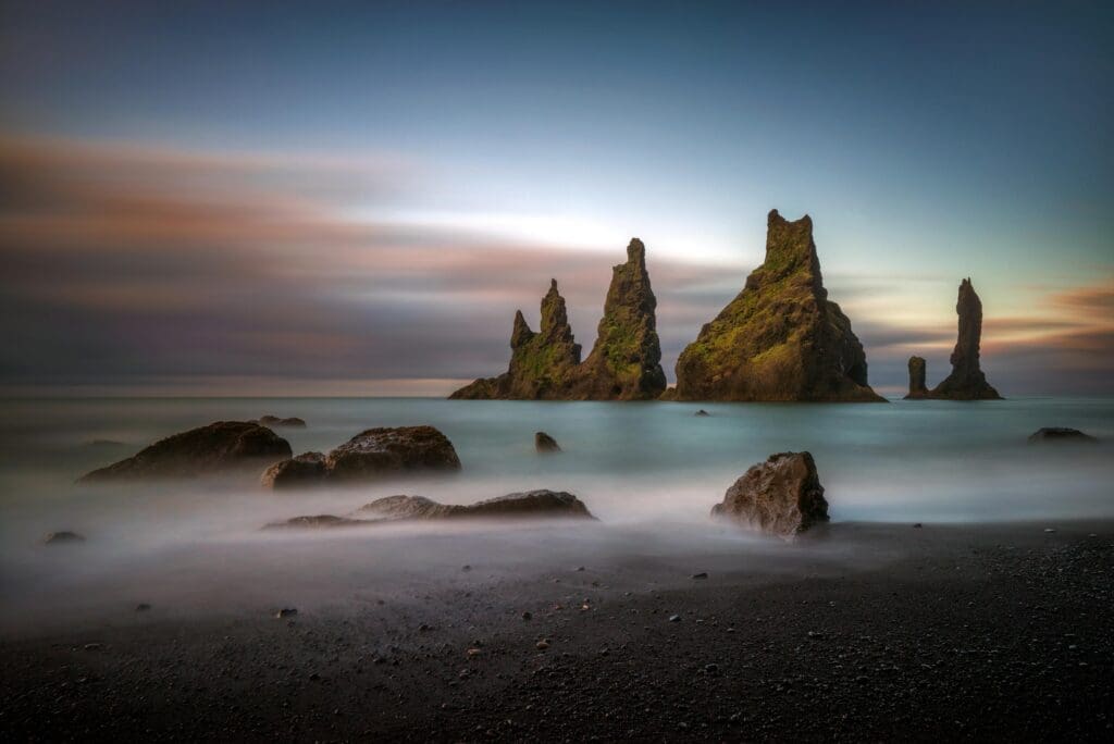 Reynisdrangar is a collection of 66 m (216 ft) high basalt sea pinnacles rising out of the sea by Reynisfjara. An old tale says they originate from when two trolls tried dragging a three-masted ship to land at night, but when daylight broke they along with the ship became these stacks of pinnacles standing out in the sea. Reynisdrangar is the same geological formation as the 340 m (1,115 ft) high mountain Reynisfjall hovering over them. This mountain is made of volcanic tuff from an eruption under a glacier in the penultimate Ice Age, with irregular layers of tuff, pillow lava, and veins and loops of columnar basalt. The mountainsides are steep and by the beach, these beautiful formations of basalt columns can be seen. It is the nesting site of puffins and other sea birds, so please do not try to climb up to them so as not to disturb them. Basalt columns are a great inspiration for Hallgrímskirkja church, Þjóðleikhúsið (e. The National Theatre of Iceland), and Harpa Concert Hall and Conference Center. In the southern part of Reynisfjara by the beach is Hálsanefshellir, an extremely beautiful basalt cave. Please only try going into it when there’s a low tide so the waves don’t pull you out, and be aware that rocks can suddenly fall.