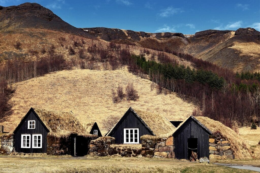 Skógafoss is within the tiny village of Skógar with a population of about 25 people, and the Skógar Regional Museum is close to the waterfall, featuring over 18,000 regional artifacts in six historical buildings. It’s three museums in one which show how Icelanders have lived throughout history; an open-air museum with old wooden houses and turf houses, a folk museum with a cultural heritage collection, and a technical museum showing the evolution of transport, communication, and technology in Iceland. In the folk museum is a noteworthy golden handle that is said to be from a chest filled with gold, owned by the settler Þrasi Þórolfsson who hid the chest behind Skógafoss before his death around AD 900. Attempts were made by many to retrieve it until one day a rope was fixed to the handle to pull the chest out but the handle broke off, leaving the gold-filled chest lost forever. That handle served as a door handle on the Skógakirkja church till 1890.