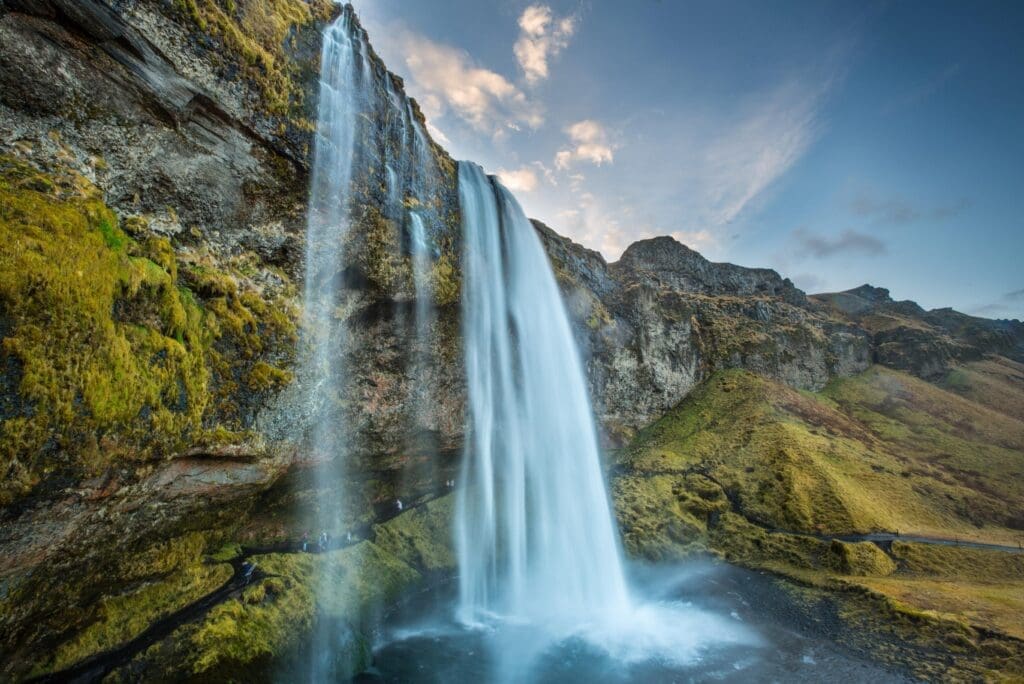 The 62 m (203 ft) high majestic waterfall Seljalandsfoss is fed by spring water originating in the moor Hamragarðaheiði and is part of the river Seljalandsá. Many think it is fed with melting water from the glacier-capped Eyjafjallajökull, a volcano that famously erupted in 2010 and affected air traffic throughout Europe, but the water in Seljalandsfoss is bright and clean due to it being spring water. It cascades into a beautiful meadow, like a curtain over a tall cliff that once marked a coastline by the ocean before eruptions extended the land, and behind the waterfall is a walking path for a unique angle of the waterfall and its surroundings. This trail continues from behind the waterfall and around it. The picturesque Seljalandsfoss is among the most photographed waterfalls in Iceland for a reason. For instance, it was featured in Justin Bieber‘s music video I’ll Show You and was the first leg of the sixth season of the American series The Amazing Race.