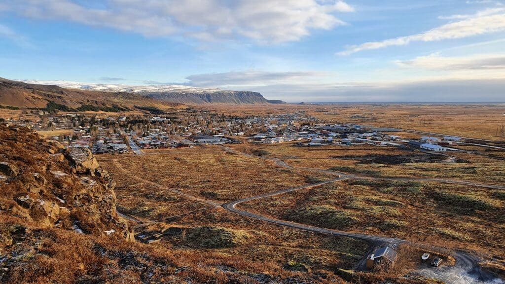 In the greenhouse town of Hveragerði, we stop at the local shopping center. There we visit a fissure that was created during an earthquake.