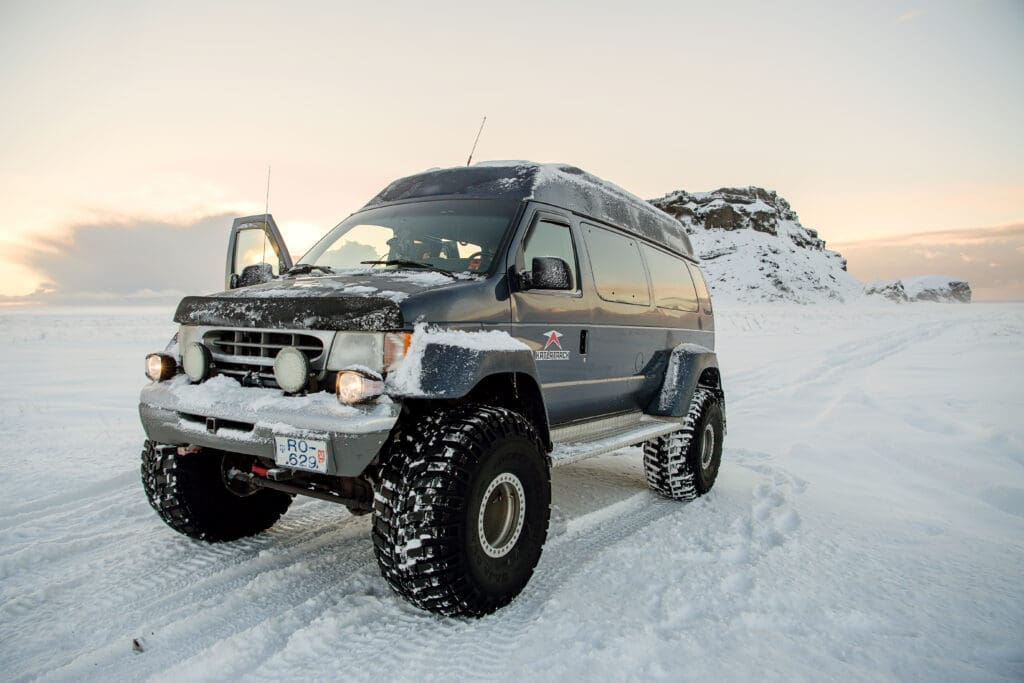 Your private Katla ice cave tour in Iceland begins in Vík, where you’ll meet your expert local guide. From here, we set off in a powerful super jeep.