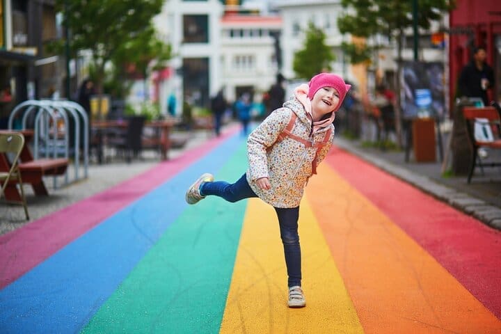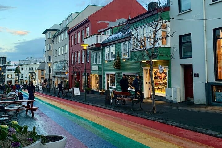 A colorful street lined with shops and galleries, leading straight up to Hallgrímskirkja — perfect for a scenic stroll.