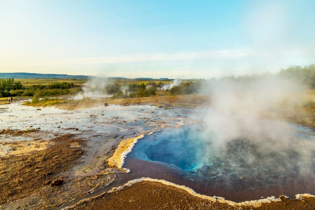 Geysir (e. Spouter) is the most renowned geological phenomenon in Iceland, giving its collective name geyser to all other hot springs in the world. It is currently dormant and hasn’t spouted since 2016, but earthquakes in the area and volcanic activity in our country may cause Geysir to awaken someday and the other hot springs in this geothermal area to show changes in behavior.