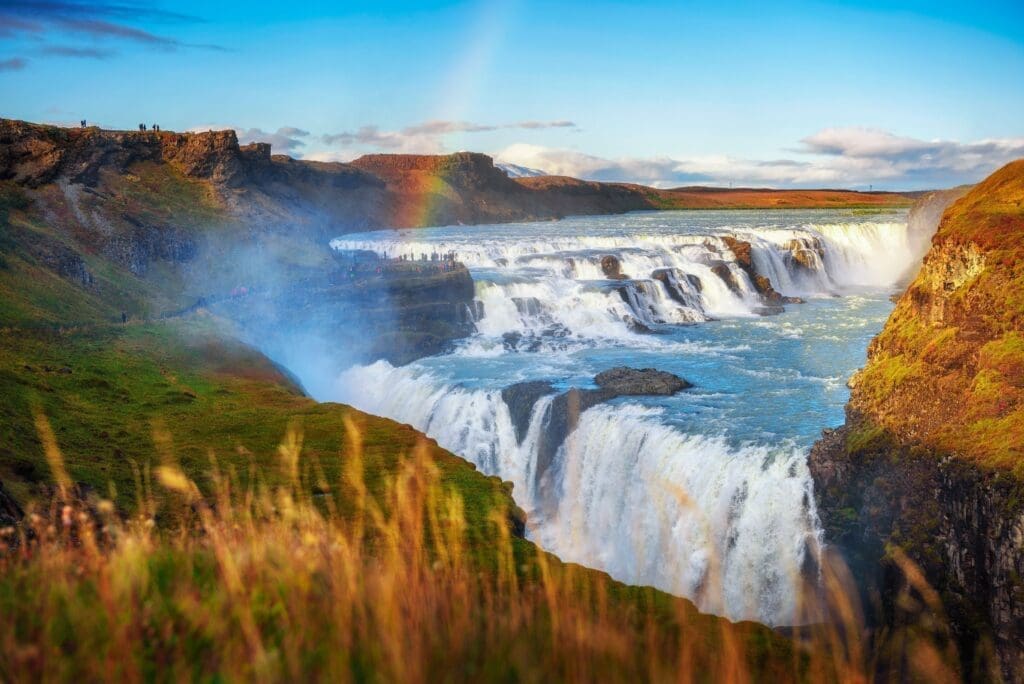 The last stop on our tour is Gullfoss waterfall, also known as Golden Falls. This magnificent tiered waterfall is considered the queen of all waterfalls in Iceland, plunging 32 meters into a narrow basaltic gorge. The white glacial river Hvítá, fed by the Langjökull glacier, gives Gullfoss its distinctive white and blueish color, and on sunny days, you'll be treated to the sight of a spectacular rainbow, or even a double rainbow, created by the mist rising from the falls.